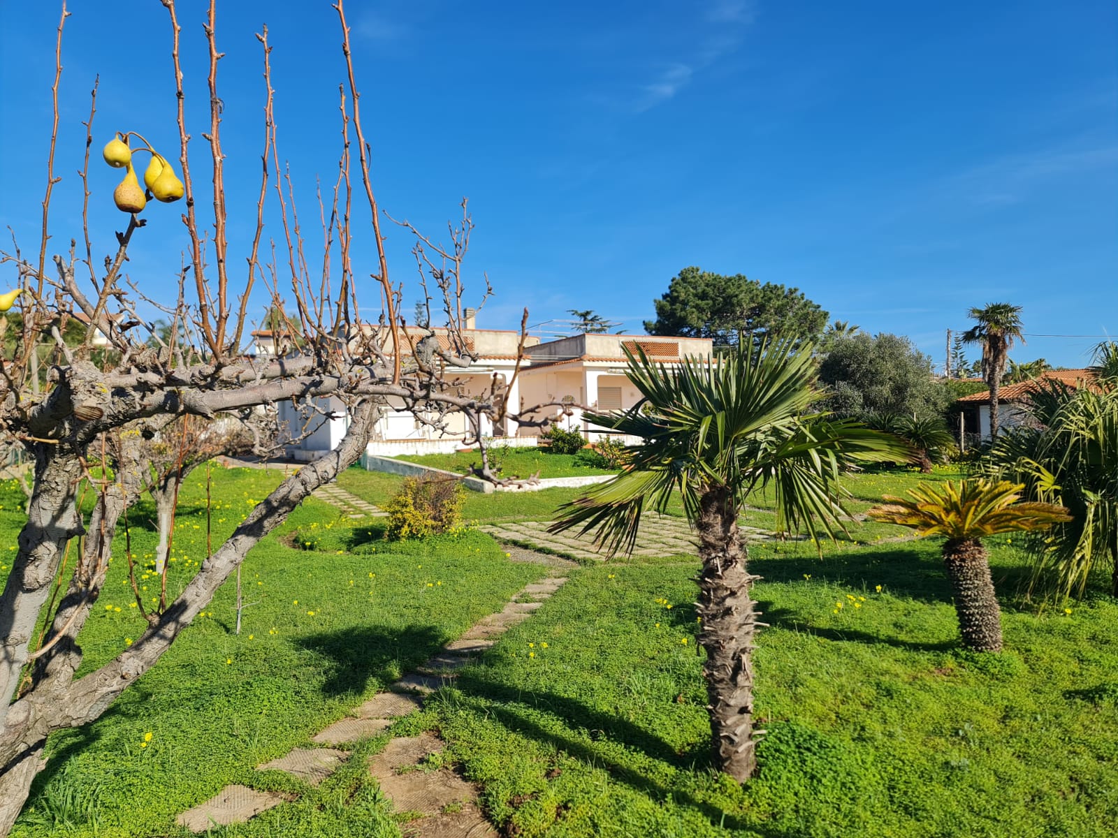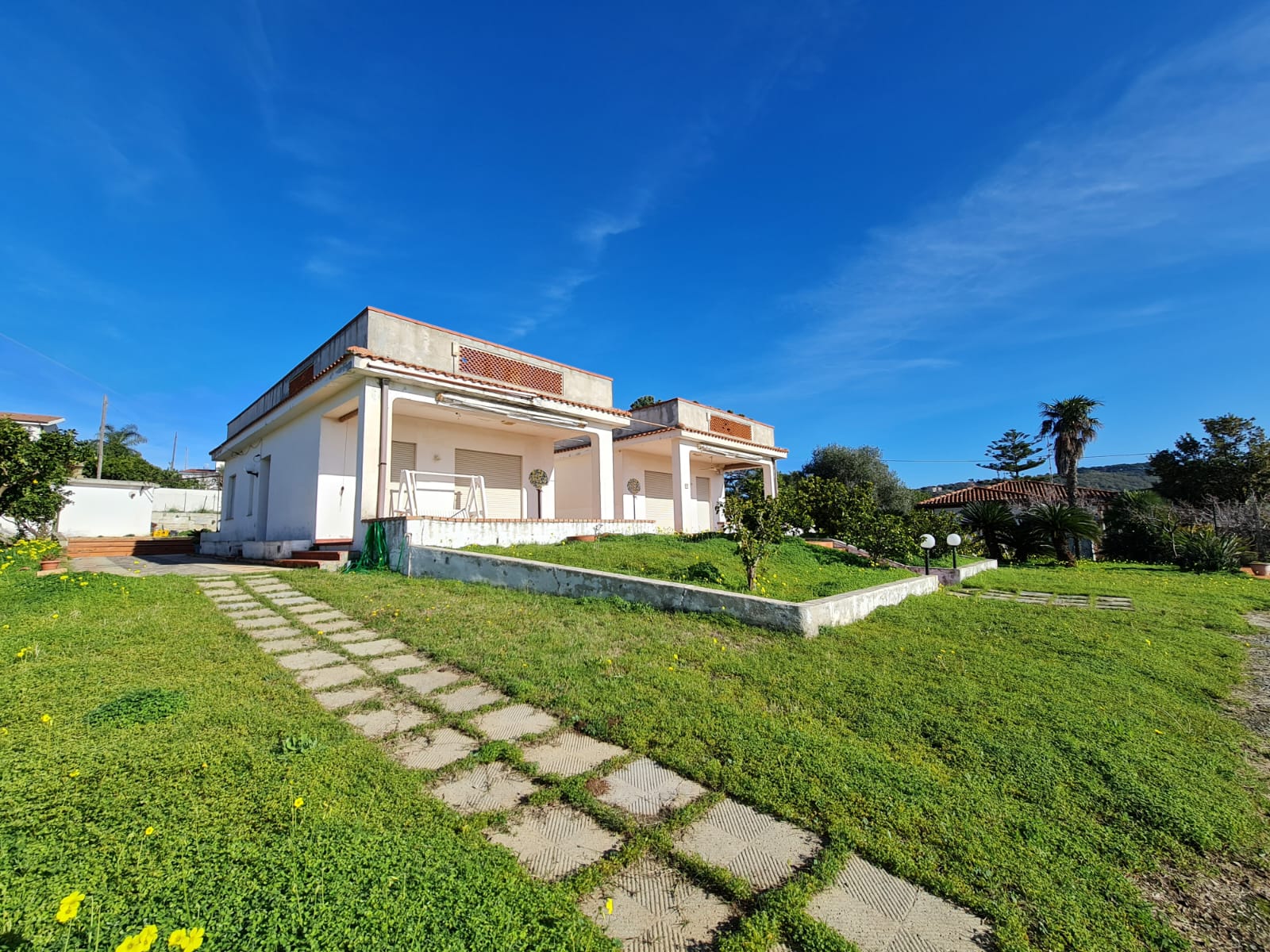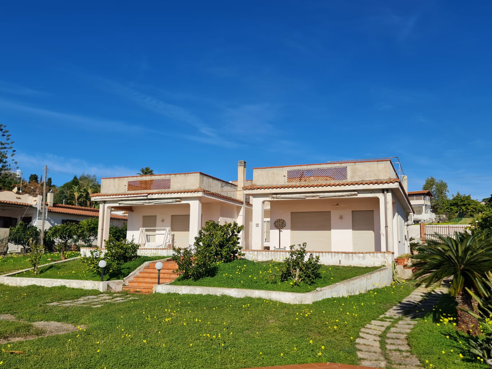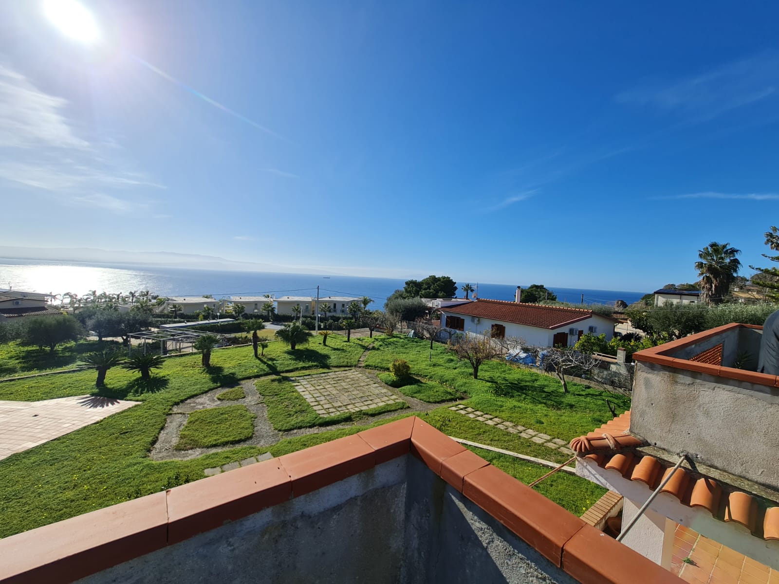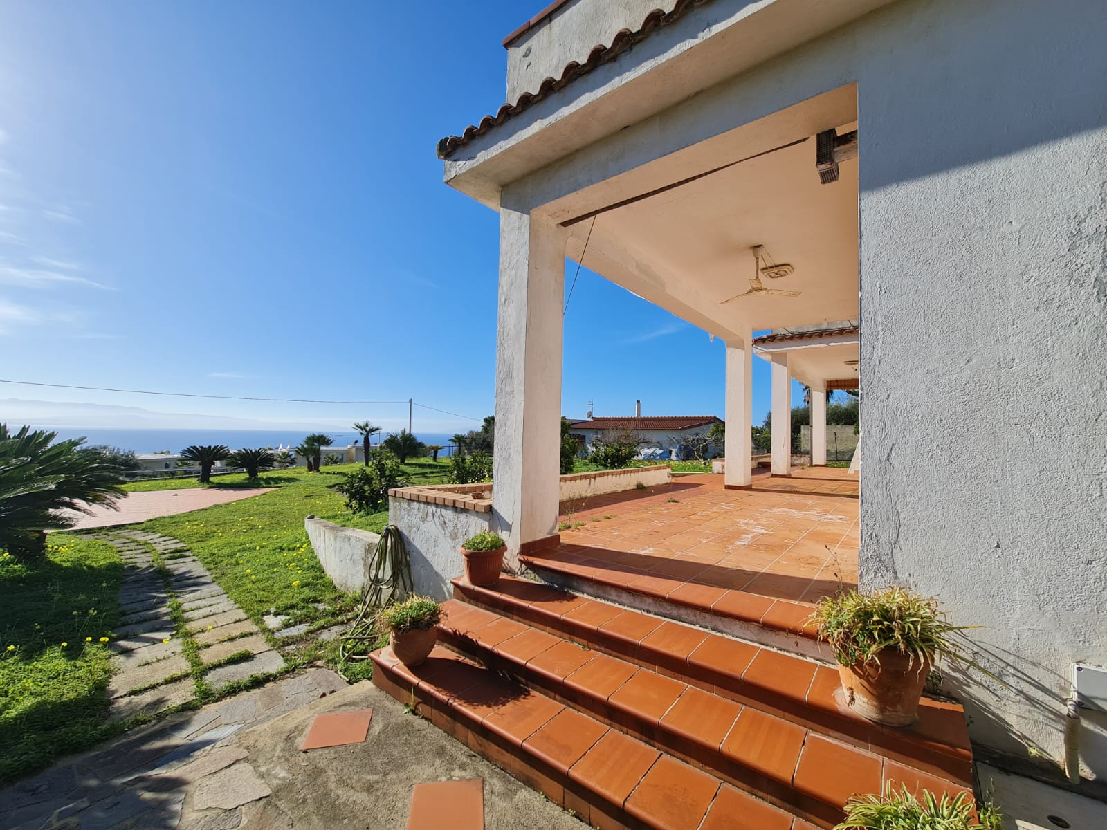 The property is located on a large site, which has development into a nice established garden, offering privacy, space and unobstructed views on the Coast, especially the straits of Messina, Mount Etna, and all the Aeolian Islands.