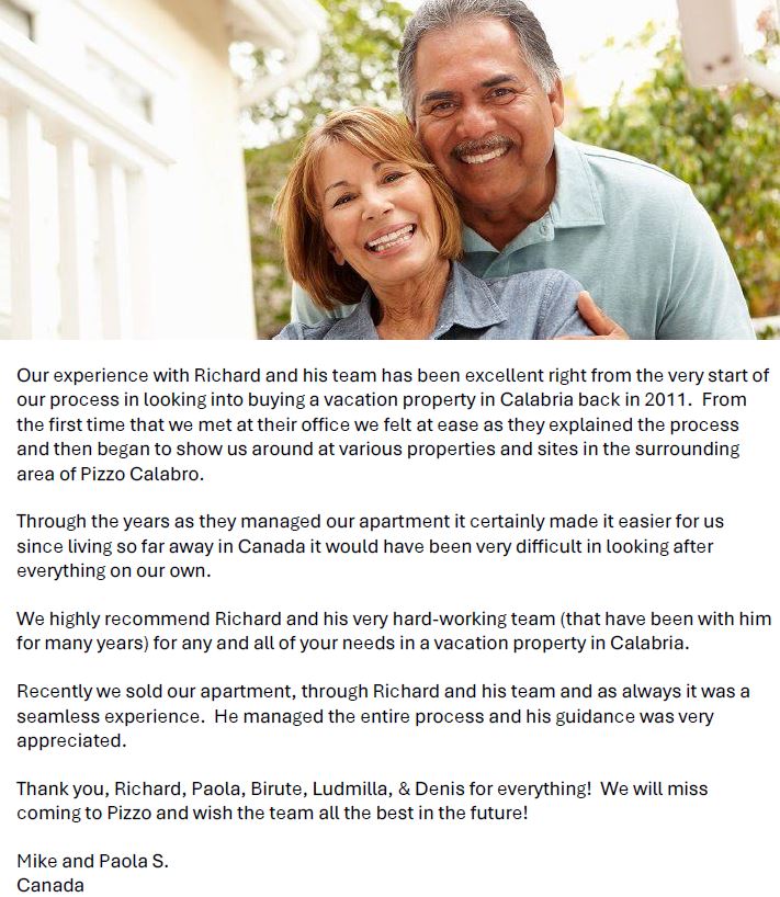 We highly recommend Richard and his very hard-working team (that have been with him for many years) for any and all of your needs in a vacation property in Calabria.
