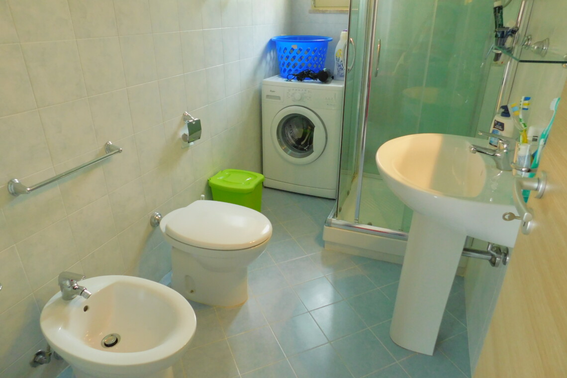 Family Bathroom – Shower, sink, toilet, bidet & washing machine.