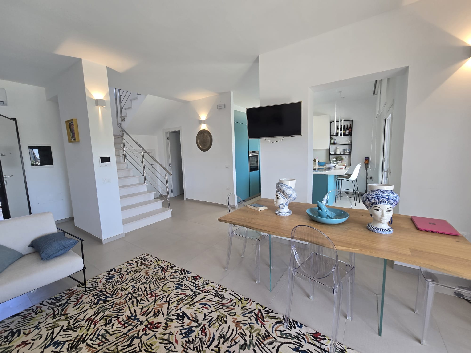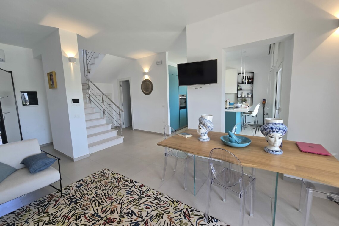 A standout example is the custom-designed blue kitchen, crafted by a local artisan brand, inspired by the stunning sea tones of nearby Tropea. This signature hue flows elegantly throughout the home, tying each space together in a harmonious palette reminiscent of coastal southern Italy.